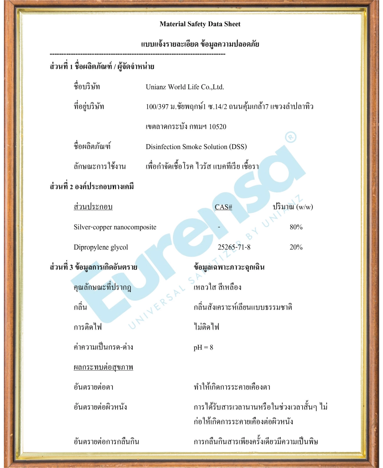 "Eurensa" แบรนด์ ที่ถูกก่อตั้งขึ้นโดย บริษัท ยูนิ แอนซ์ เวิลด์ ไลฟ์ จำกัด เรานำวิธีการพ่นฆ่าเชื้อที่ถูกใช้ ในห้องผู้ป่วยติดเชื้อของโรงพยาบาลที่มีมาตรฐานระดับสากล มา ปรับให้ใช้ง่าย สะดวก รวดเร็วมากยิ่งขึ้น และเหมาะกับการใช้งาน ในครัวเรือน เพื่อให้เกิดเป็นมาตรฐานใหม่ของการทำความสะอาด ซึ่งจากการศึกษาวิจัยพบว่าลำพังการทำความสะอาดแบบทั่วไป ไม่ว่าจะเป็นการเช็ด ปัด กวาด ถู สามารถทำความสะอาดได้เพียง ส่วนหนึ่งเท่านั้น การเพิ่มกระบวนการฆ่าเชื้อโรคเข้าไปโดยวิธีพ่น หมอกหรือวิธีอื่นๆด้วยน้ำยานาโนฆ่าเชื้อโรค Eurensa ไม่เพียง แต่จะทำให้พื้นที่สะอาดขึ้น แต่ยังสามารถกำจัดเชื้อโรคที่ตามองไม่ เห็นได้มากถึง 99.99% รับรองโดยผลการทดสอบด้วยวิธี มาตรฐานสากลจาก สวทช.